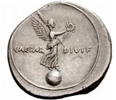 When Octavian became the sole ruler of the Roman world following his defeat of Mark Antony and Cleopatra at the sea battle of Actium, the iconography chosen by Octavian and his administrators naturally employed well known images representing divinely assisted victory.  So, this coin uses the globe to show world domination, a victory only possible by divine assistance.  Engraving the words DIVI F next to the name Caesar tells the world that he, Octavian, is world ruler and son [FILIUS] of the deified [DIVI] Caesar, Julius Caesar.  As is frequently the case in Graeco-Roman iconography of the goddess Nike, the goddess of divine victory, she is holding a palm frond.