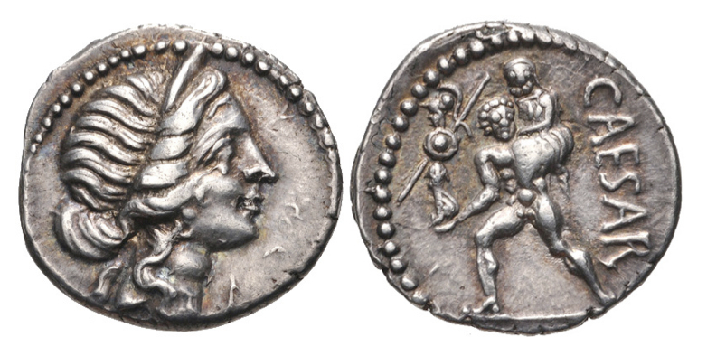 A Roman denarius with the obverse showing the