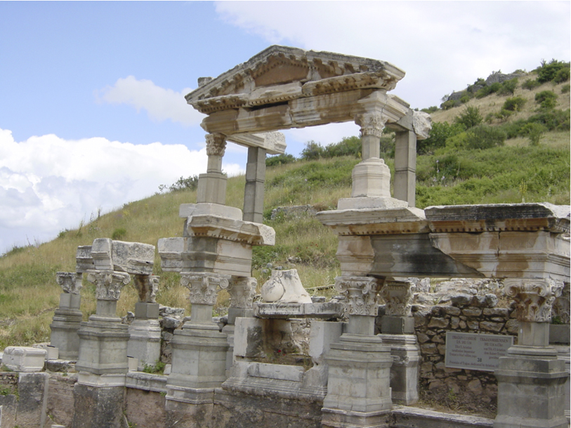 - This Ephesian monument is known as the Fountain of Trajan (Nymphaeum Traiani) and was dedicated to this emperor no later than AD 114. The center niche originally contained a colossal statue of the emperor Trajan. The fragmentary remains include the foot of the Emperor Trajan next to a globe representing a subservient earth. © copyright holder of this work is Richard E. Oster. Page 39, figure 27.