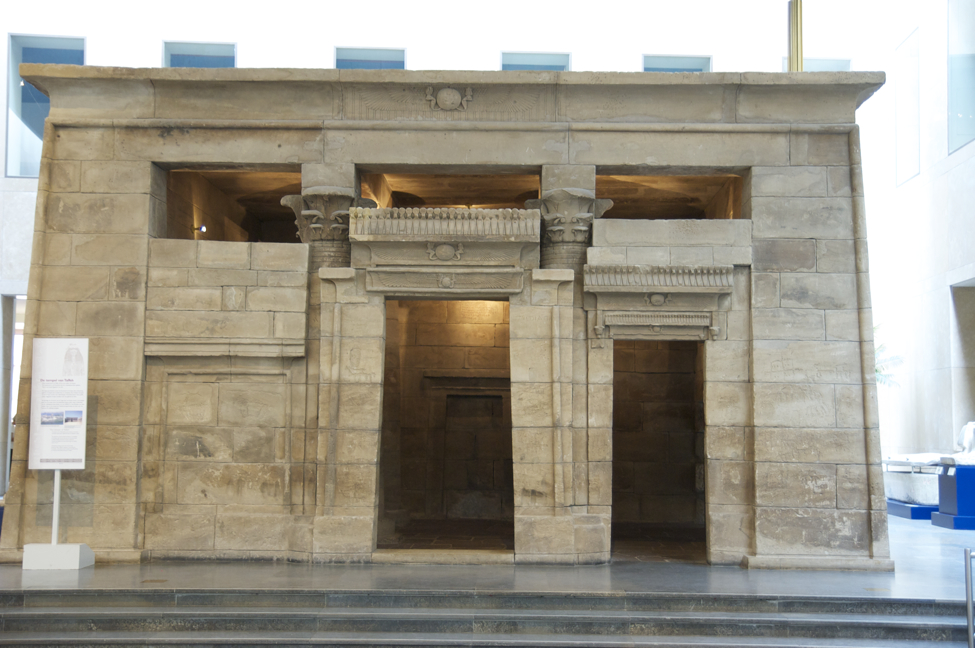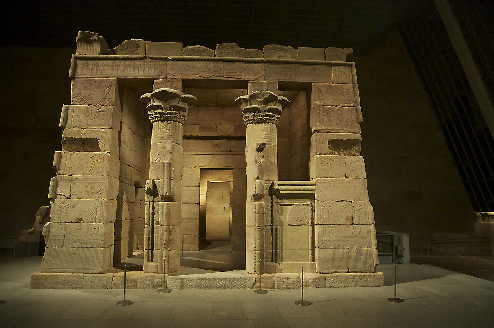 This Temple of Dendur was built during the early reign of Augustus in ancient Nubia as a site for worship of Isis and other Egyptian deities. The reason for its construction was to establish Roman hegemony on this border region along the Nile. On some of the walls the Roman Emperor Augustus is depicted as a Pharaoh worshipping the Egyptian gods and goddesses. The temple was relocated to the Metropolitan Museum of Art in New York City and was erected in the Museum in 1978. © copyright holder of this work is Richard E. Oster. Page 33, figure 15.